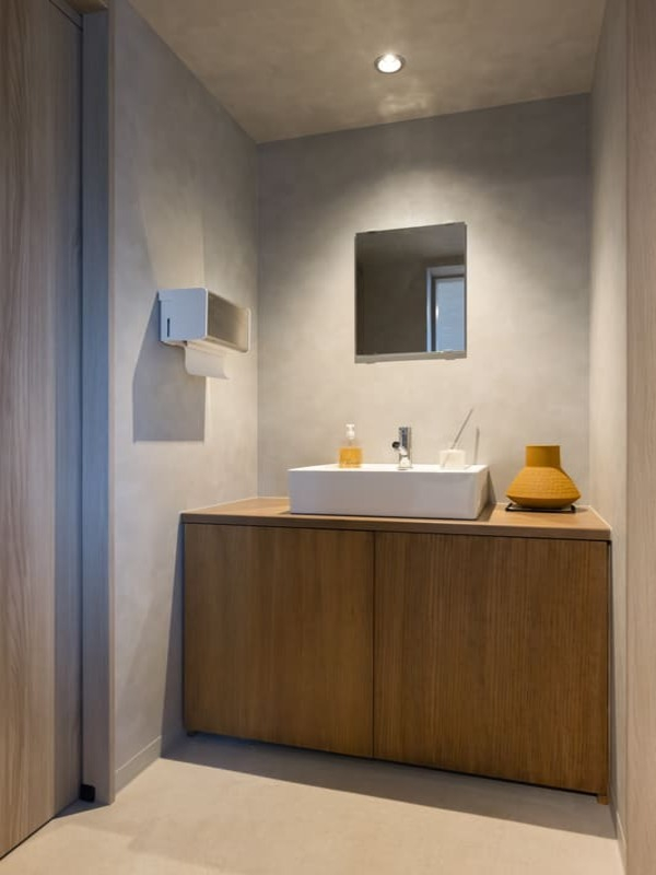 無機質な事務所だった空間が、人が集うカフェカウンターへと生まれ変わりました。動線や使い勝手を見直しながら、開放感と温もりを感じられる空間へ再構築。日常の中でふらっと立ち寄りたくなる、居心地のよい場所をつくりました。