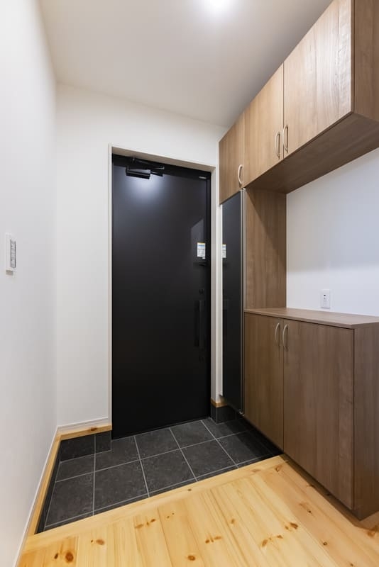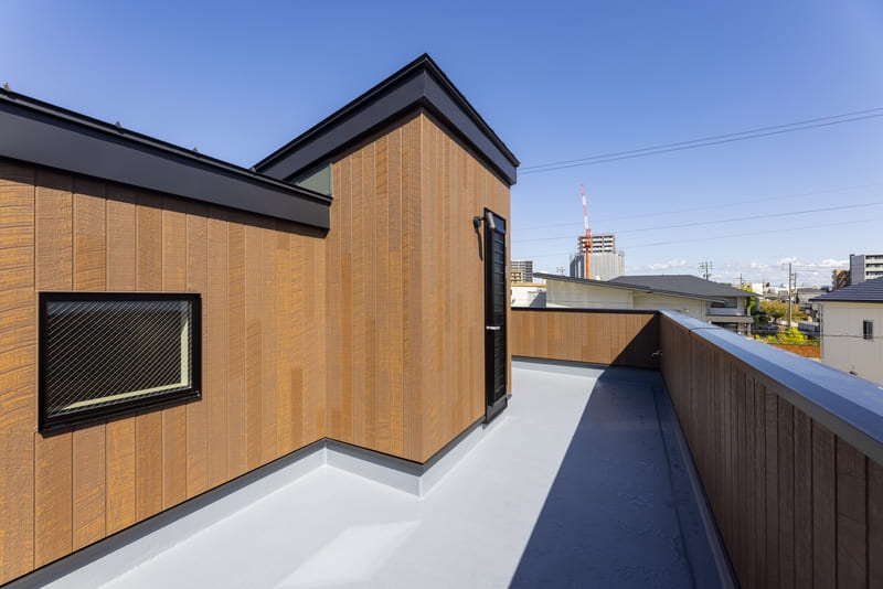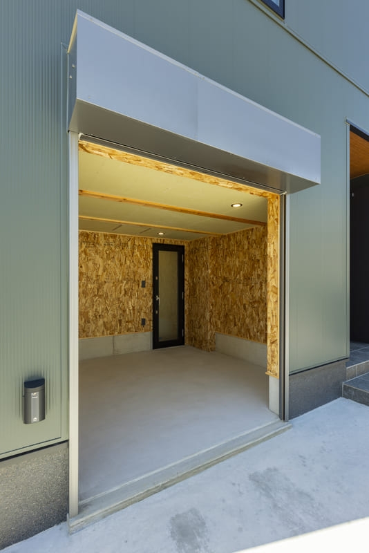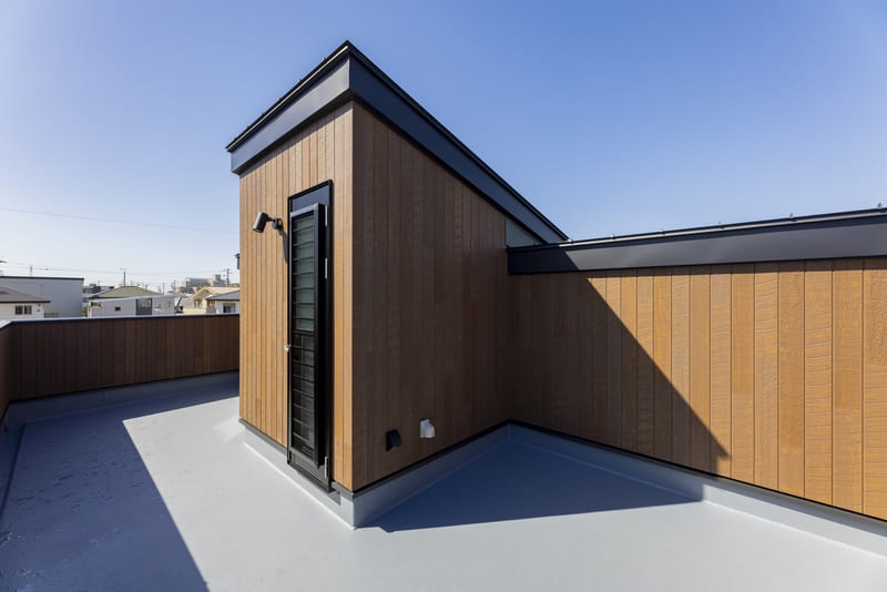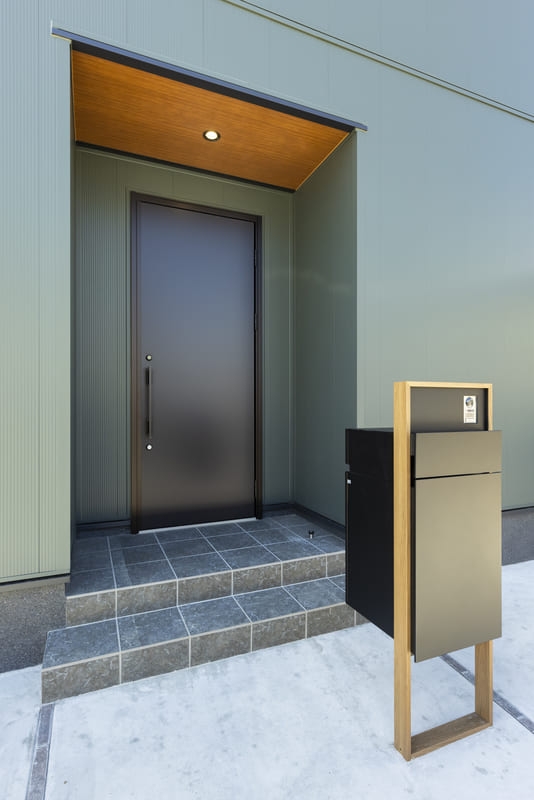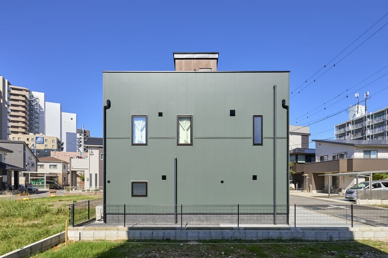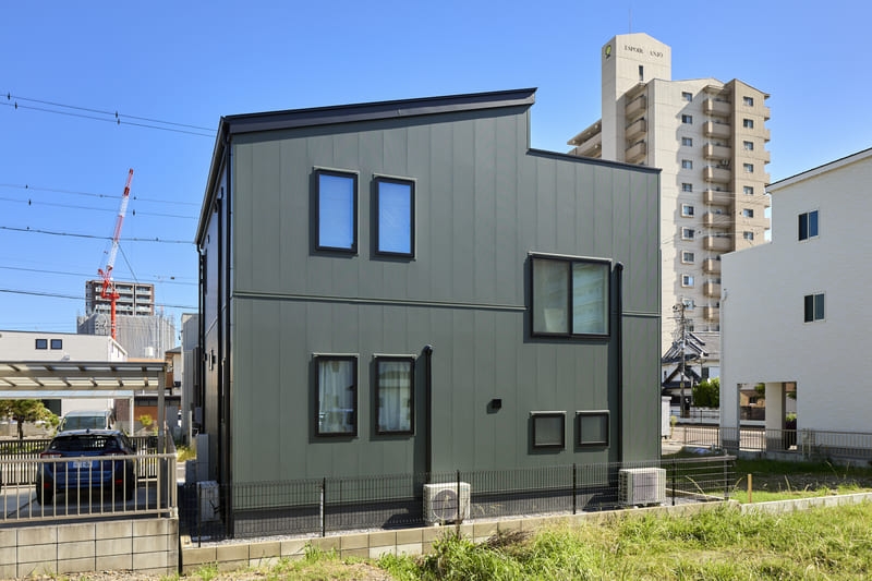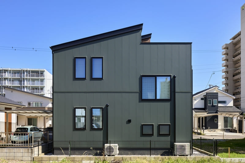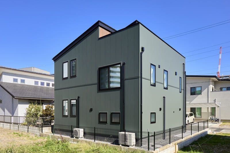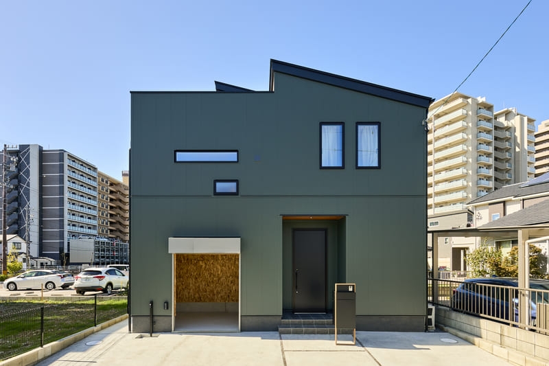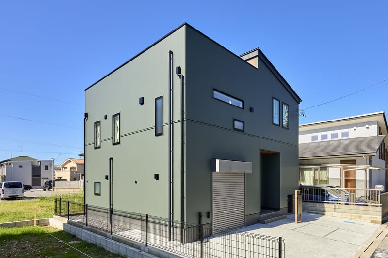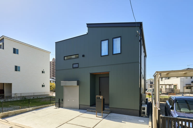 落ち着いたモスグリーンの外観が、周囲の自然や街並みに美しく馴染む住まい。玄関まわりの収納力を高める屋外ストッカー、日常に癒しを与える屋上空間。プライベート性と非日常感を両立させた、心地よい暮らしを叶える住まいとなりました。