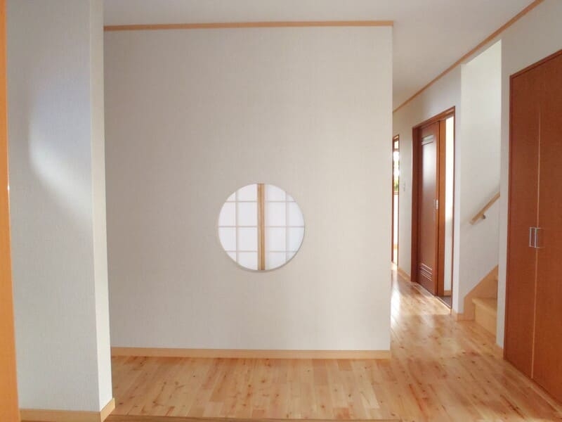 玄関ホールに足を踏み入れると、まず目に飛び込んでくるのは、やわらかな存在感を放つ屋内の丸窓。直線的になりがちな空間に、円の曲線がリズムと奥行きを与え、住まい全体の印象を一段と印象的なものにしています。 来客を迎える際には、和の趣をさりげなく伝えるアイキャッチとなり、日常では家族の心を落ち着かせるアクセントに。伝統的な意匠を現代の住まいに取り入れた、上質で記憶に残る一軒家です。