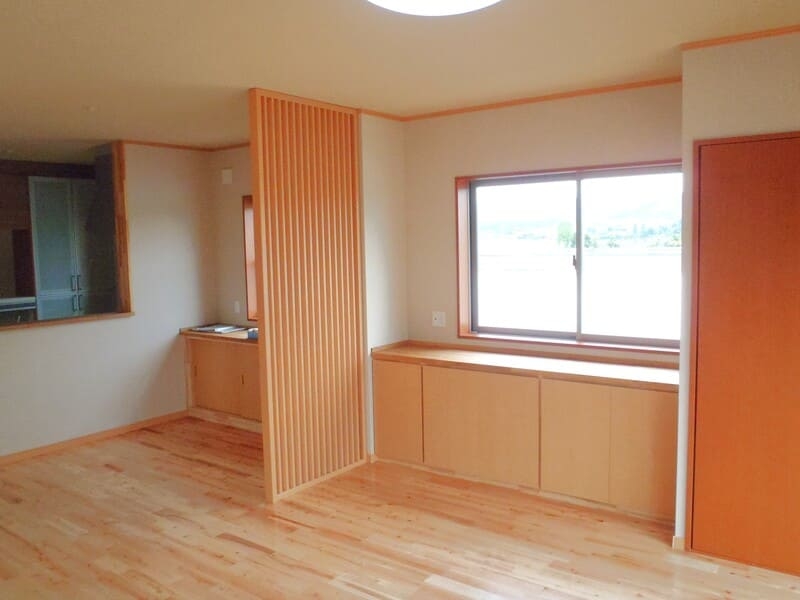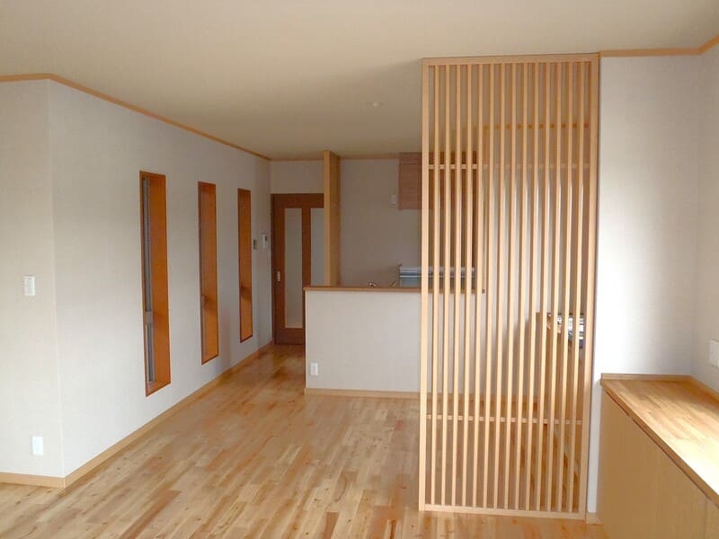 ダイニングとリビングの間にはあえて1メートルほどの格子を設置。空間をゆるやかに区切りながらも視線が抜け、開放感を損なわない設計です。用途を分けつつ、家族の気配を感じられる、程よい距離感を実現しています。