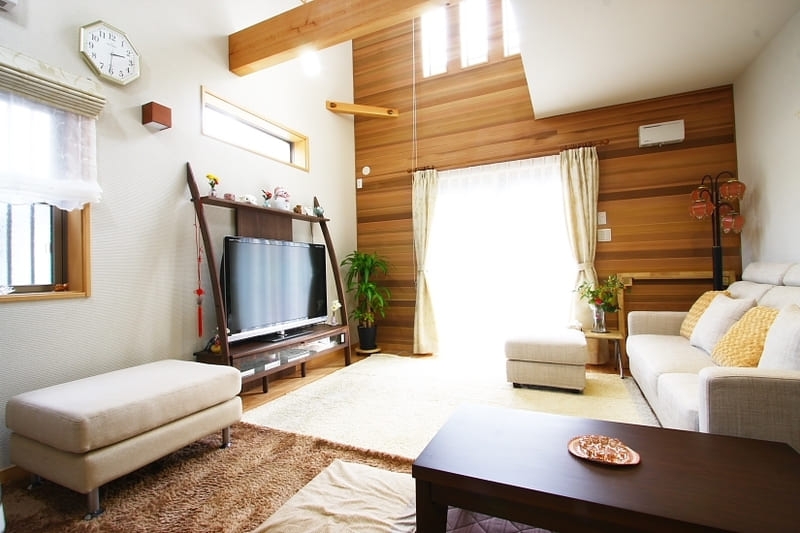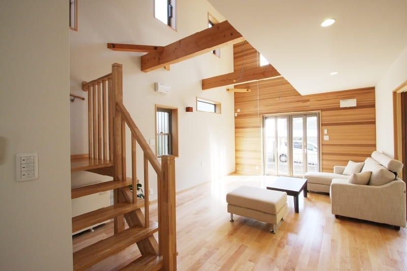 吹き抜けの光が家族をつなぐ、開放感あふれる住まい。三連の大きな窓から差し込む柔らかな自然光が、リビング全体を明るく包み込みます。リビング階段が空間にアクセントを加え、家族の気配を感じながら自然にコミュニケーションが生まれる間取りに。横には引き違い戸で仕切られた和室を設け、普段はリビングと一体化させて広々と使いながら、来客時やお子さまの遊び場、個室としても柔軟に活用できます。