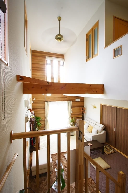 三連の大きな窓からたっぷりと自然光が差し込む吹き抜けのリビング。明るさに加えて、リビング階段が空間に奥行きをもたらし、実際の広さ以上に開放的に感じられる設計です。