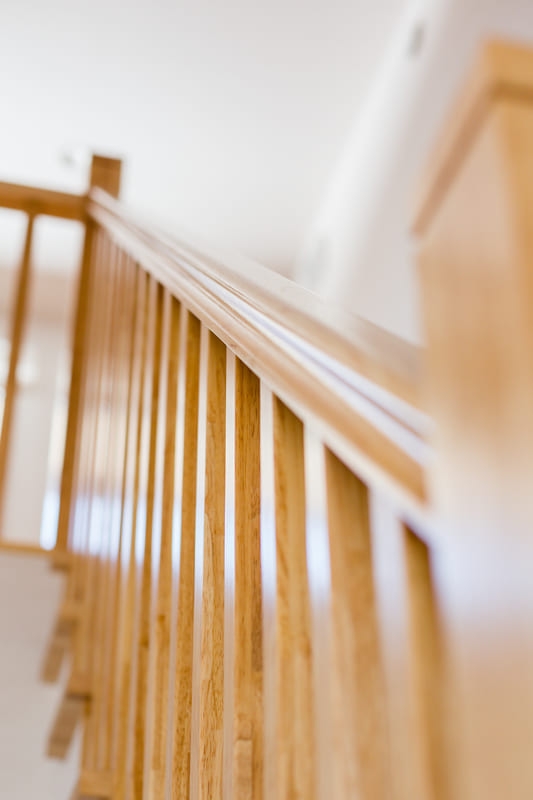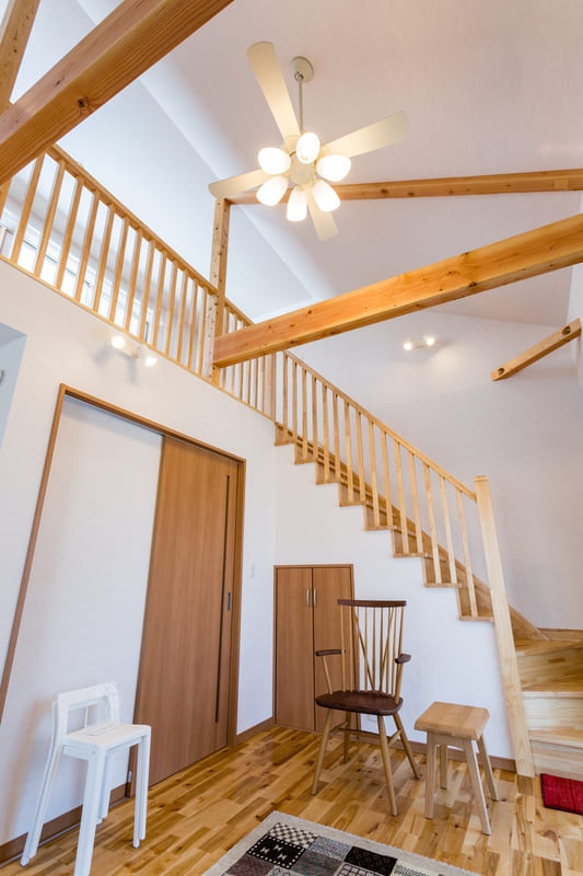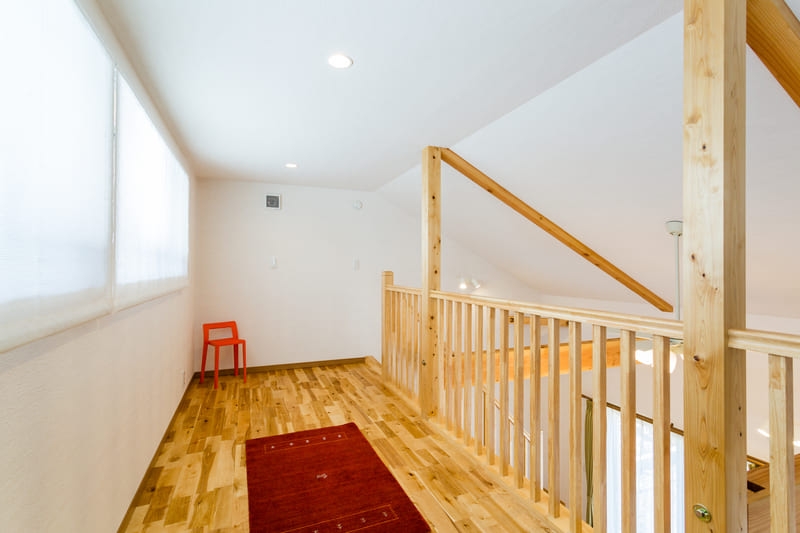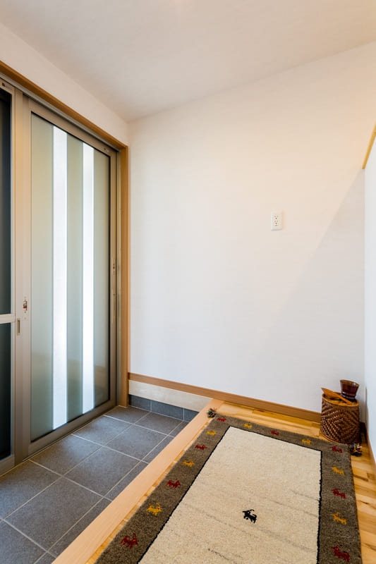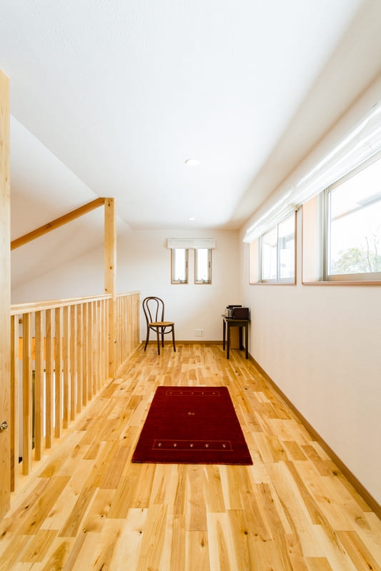 ご夫婦二人暮らしにちょうどいいサイズ感の中で、「廊下をつくらない」という考え方を軸に計画した住まいです。 一階は10帖の洋室を中心に、キッチン・洗面・浴室・トイレへ直接アクセスできる動線とし、移動のためだけのスペースを省くことで、限られた床面積を有効に活用しています。
