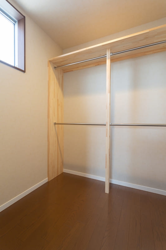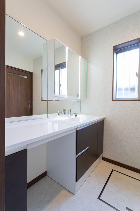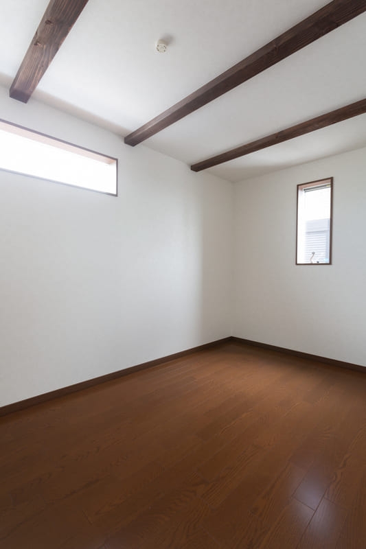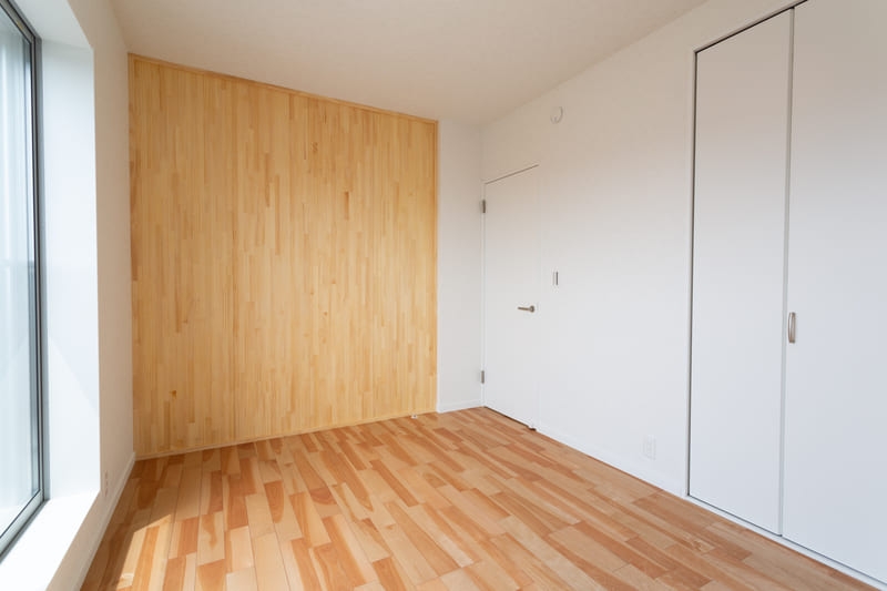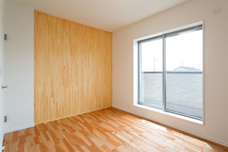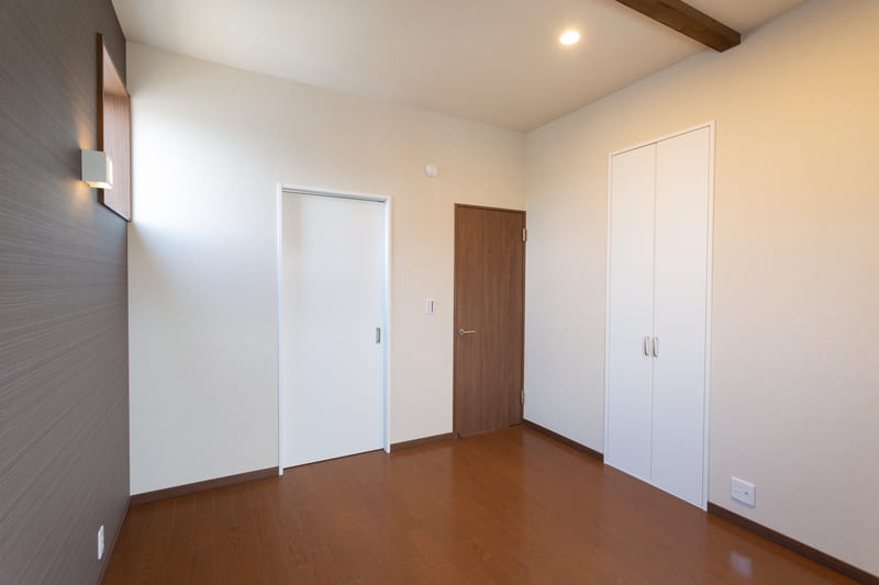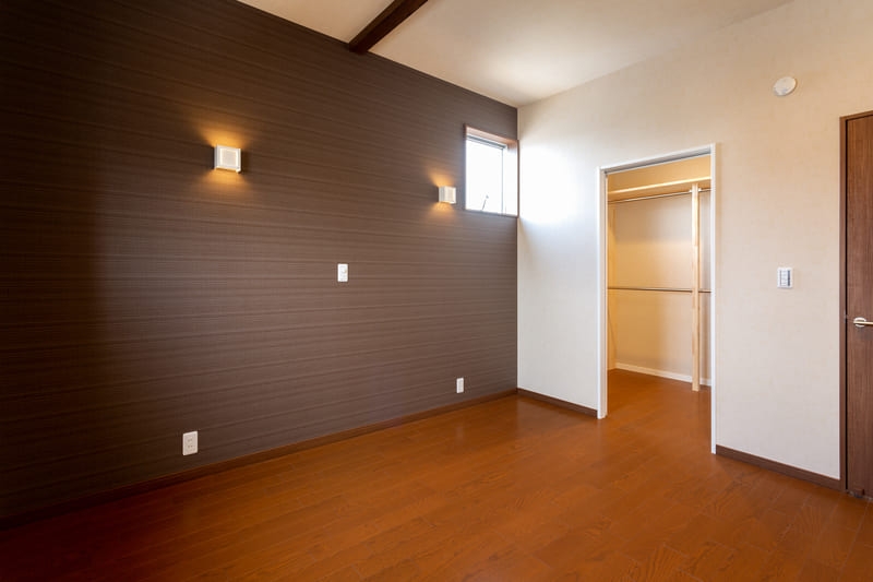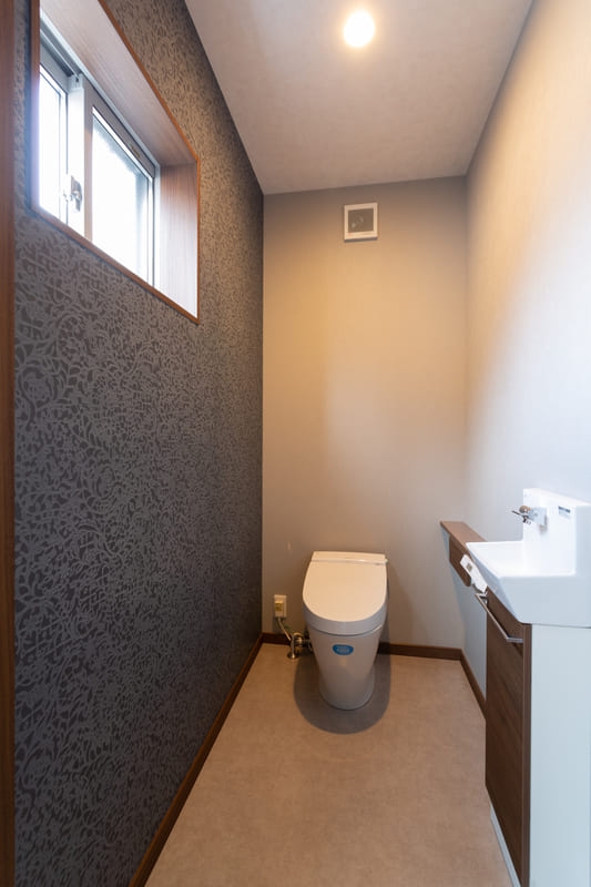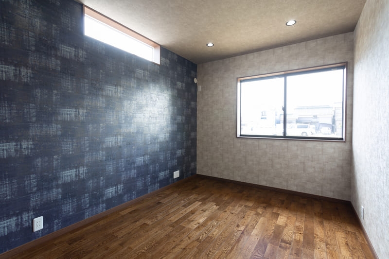 柱やトイレ、二階の洋室にはアクセントクロスを取り入れ、シンプルな中にも遊び心をプラス。空間ごとに表情の違いを楽しめるよう工夫しながらも、色味を抑えることで全体に統一感を持たせています。