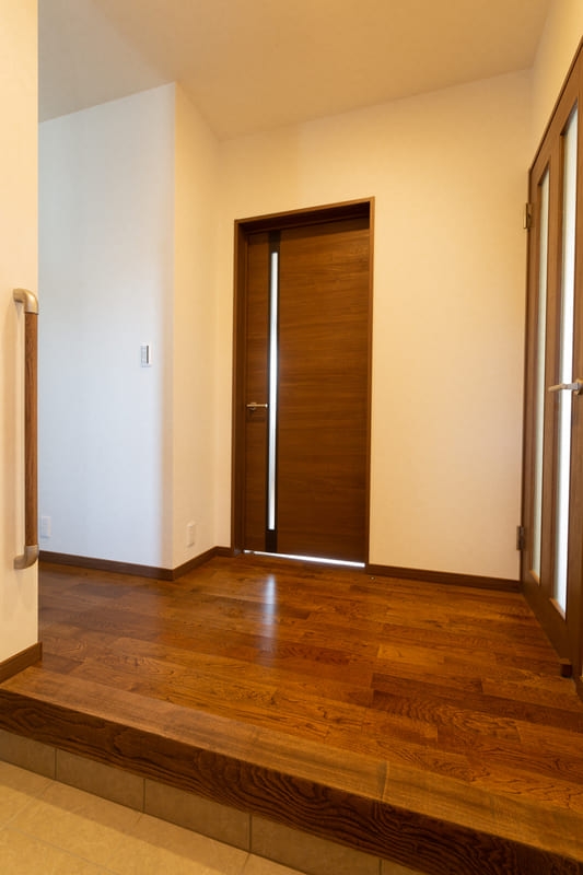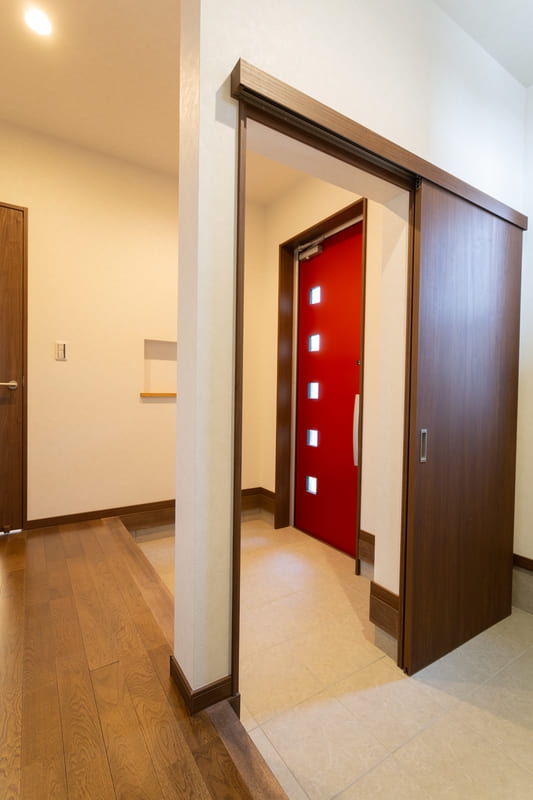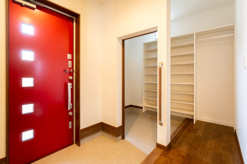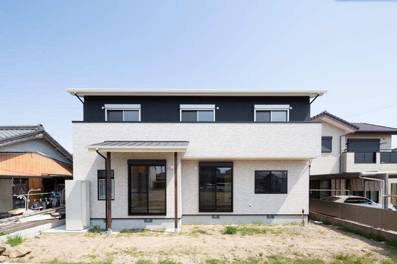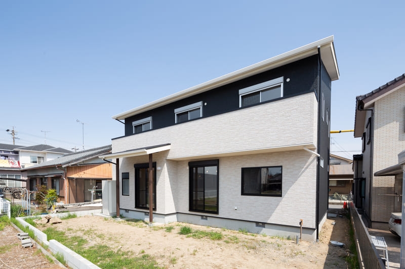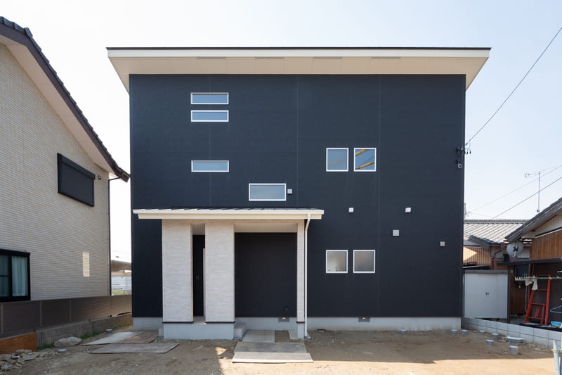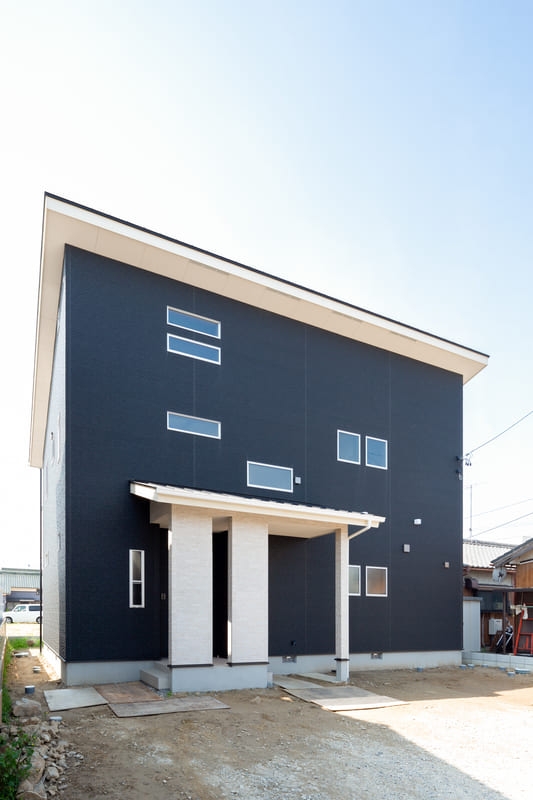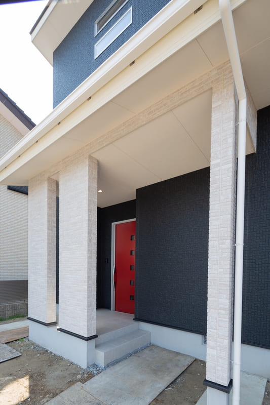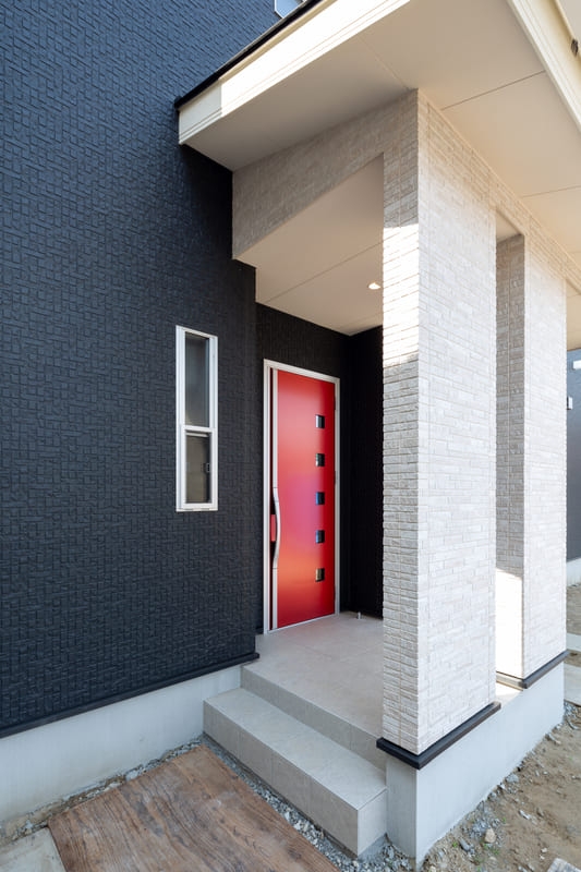 シンプルさの中に個性が映える、モダンスタイルの住まい。直線的なフォルムと計算された窓配置が、洗練された印象を与えます。パッと目を引く赤い玄関ドアが、さりげないアクセントに。シンプルでありながら存在感のあるデザインは、街並みに自然と馴染みつつ、長く愛される住まいとなっています。